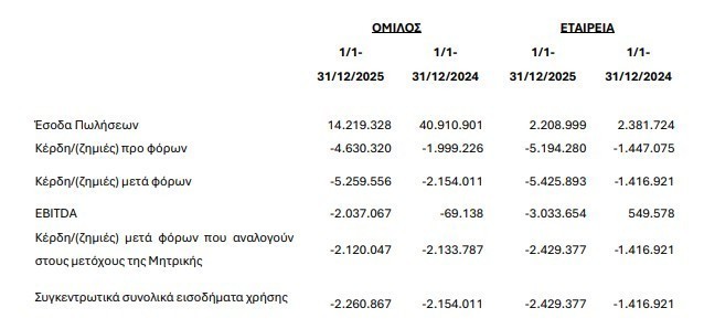 Τα συγκεντρωτικά συνολικά εισοδήματα της χρήσης του Ομίλου μειώθηκαν από ζημίες €2.154.011 το 2024 σε ζημίες € 2.260.867 το 2025.