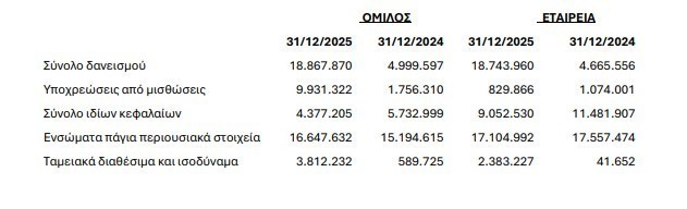 Οι δανειακές υποχρεώσεις του Ομίλου την 31/12/2025 αυξήθηκαν κατά € 13.868.273 συγκρινόμενες με εκείνες της 31/12/2024, λόγω της προαναφερθείσας ανάληψης νέων δανείων από τη Μητρική εταιρεία, ενώ οι αποπληρωμές δανείων ανήλθαν σε € 1.799.565.