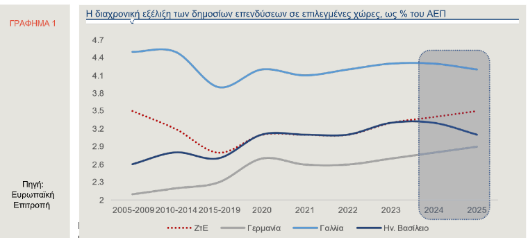 Πρόσφατη μελέτη της Ευρωπαϊκής Κεντρικής Τράπεζας (ΕΚΤ) αναφέρει ότι για να προχωρήσουν τα παραπάνω έργα απαιτείται ένα μείγμα δημόσιων και ιδιωτικών επενδύσεων, περισσότερων από αυτών που έχουν γίνει στο παρελθόν, που υπολογίζονται σε επιπρόσθετα 5,4 τρισ. ευρώ, για την περίοδο 2025-2031, (“Mind the gap: Europe’s strategic investment needs and how to support them”, ECB, June 2024). Σε άλλη πηγή της Ευρωπαϊκής Επιτροπής (European Commission, 2023 Strategic Foresight Report), που κινείται στα ίδια επίπεδα, εκτιμάται ότι τα επόμενα έτη απαιτούνται 620 δισ. ευρώ επιπρόσθετων επενδύσεων ανά έτος για την πράσινη μετάβαση, 125 δισ. ευρώ ετησίως για τον ψηφιακό μετασχηματισμό, ενώ θα χρειαστούν επιπλέον κεφάλαια – πέρα από τα 240 δισ. ευρώ που δαπανήθηκαν το 2022 – για την ευρωπαϊκή άμυνα, τα οποία αναμένεται να προσεγγίσουν συνολικά τα 500 δισ. ευρώ, στην επόμενη 10ετία. Το επενδυτικό κενό που έχει προκύψει, λοιπόν, θα πρέπει να καλυφθεί τόσο από ιδιωτικά κεφάλαια, όσο και από δημόσια. Τα τελευταία έτη παρατηρείται μία μικρή αύξηση των δημοσίων επενδύσεων ως ποσοστό του ΑΕΠ, στις χώρες της ευρωζώνης (ΖτΕ), όμως, όπως είναι προφανές από τα παραπάνω, αυτό το ποσοστό θα πρέπει να αυξηθεί (Γράφημα 1).