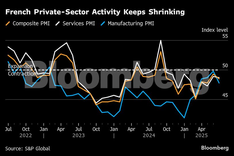 Σε αντίθεση με τη Γερμανία, η οικονομία της Γαλλίας επιβραδύνθηκε περαιτέρω τον Ιούνιο. Ο σύνθετος δείκτης PMI της S&P Global υποχώρησε στο 48,5 από 49,3, λόγω της εξασθένησης της μεταποίησης αλλά και της συνεχιζόμενης συρρίκνωσης στις υπηρεσίες.