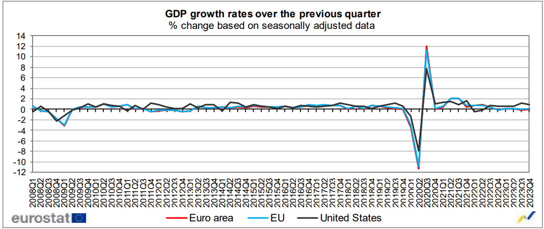 Σύμφωνα με τα τελευταία στοιχεία, η οικονομία της Ευρωζώνης παρέμεινε στάσιμη το τελευταίο τρίμηνο του 2023. Το αμέσως προηγούμενο τρίμηνο (Ιουλίου-Σεπτεμβρίου) είχε συρρικνωθεί ελαφρώς κατά 0,1%. Σε τριμηνιαία βάση μάλιστα παρουσιάστηκε ήπια ανάπτυξη 0,1% στην Ευρωζώνη.