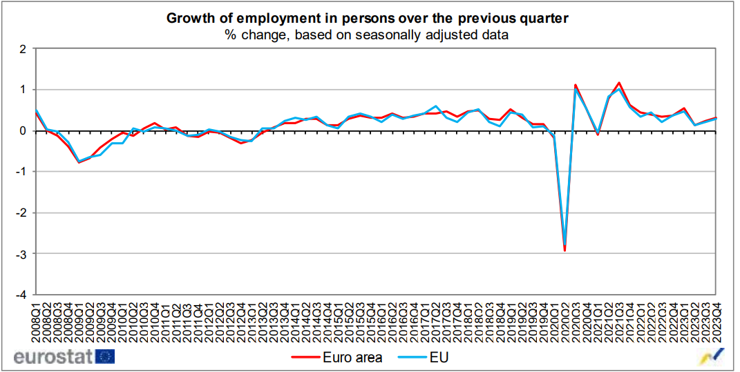 Σε ό,τι αφορά την απασχόληση, τα στοιχεία της Eurostat δείχνουν ότι ο αριθμός των εργαζομένων αυξήθηκε κατά 0,3% στο τέλος του 2023 σε τριμηνιαία βάση. Προηγουμένως, η απασχόληση είχε αυξηθεί κατά 0,2%.