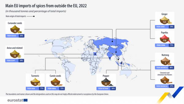 Το 2022 η ΕΕ εισήγαγε 397.000 τόνους μπαχαρικών από χώρες εκτός Ενωσης, με την Κίνα να αποτελεί την κύρια πηγή προμηθειών (38%), σύμφωνα με στοιχεία της Eurostat.