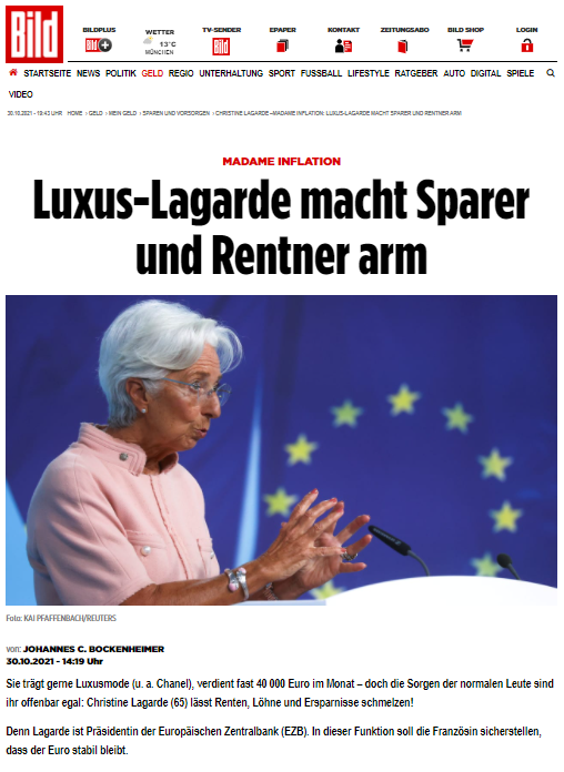Μάλιστα, η γερμανική εφημερίδα αναφέρει ότι η Κριστίν Λαγκάρντ είναι η «κ. Πληθωρισμός», κατηγορώντας την ότι είναι μία εισοδηματίας που «της αρέσει να ντύνεται πολυτελώς (μεταξύ άλλων με Chanel), βγάζει 40.000 ευρώ τον μήνα και δεν ενδιαφέρεται για τις οικονομικές δυσκολίες που αντιμετωπίζουν οι απλοί πολίτες».
