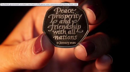 Το νέο κέρμα με τη σωστή ημερομηνία εξόδου της Βρετανίας από την Ευρωπαϊκή Ένωση, φέρει την επιγραφή «Ειρήνη, ευημερία και φιλία με όλα τα έθνη» και χαραγμένη ημερομηνία Brexit την 31η Ιανουαρίου. Περίπου 3 εκατομμύρια κέρματα θα κυκλοφορήσουν σε όλη τη χώρα από την Παρασκευή, και επιπλέον 7 εκατομμύρια αργότερα μέσα στο έτος.