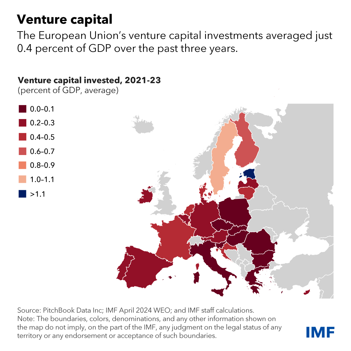 Όπως φαίνεται στον χάρτη, η Ελλάδα, όπως και αρκετές ακόμα χώρες της ΕΕ, βρίσκονται στην χαμηλότερη βαθμίδα (έως 0,1%) σε ποσοστό επενδύσεων venture capital προς το ΑΕΠ.