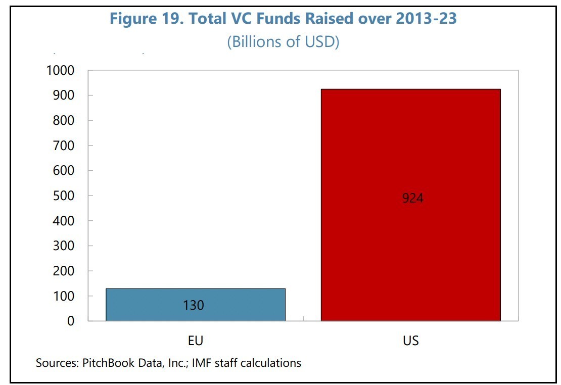 To report των οικονομολόγων του Διεθνούς Νομισματικού Ταμείου, Nathaniel Arnold, Guillaume Claveres, Jan Frie, με τίτλο «Europe Can Better Support Venture Capital to Boost Growth and Productivity», εντοπίζει δύο βασικές αιτίες για το έλλειμμα ανταγωνιστικότητας της Γηραιάς Ηπείρου: