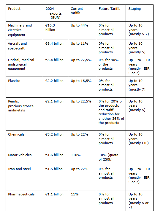 Βάσει της εν λόγω εμπορικής συμφωνίας η Ινδία θα χορηγήσει στην ΕΕ δασμολογικές μειώσεις που δεν έχει λάβει κανένας από τους άλλους εμπορικούς της εταίρους. Οι ευρωπαϊκές εταιρείες πραγματοποιούν εξαγωγές μηχανημάτων και ηλεκτρικού εξοπλισμού ύψους 16,3 δισ. ευρώ, με τους ισχύοντες δασμούς να ανέρχονται στο 44%. Βάσει της συμφωνίας οι δασμοί θα μειωθούν στο 0% σε ένα χρονικό διάστημα 5 – 7 έτη. Οι δασμοί στα αεροσκάφη οι οποίοι ανέρχονται στο 11% θα μηδενιστούν στο αντίστοιχο χρονικό διάστημα, ενώ για τα προϊόντα ιατρικού και χειρουργικού εξοπλισμού οι δασμοί, οι οποίο ανέρχονται στο 27,5% αναμένεται να μηδενιστούν επίσης για το σύνολο σχεδόν αυτών των προϊόντων.