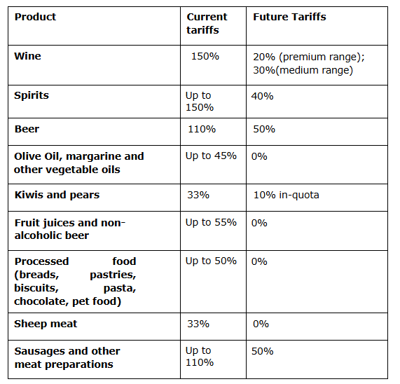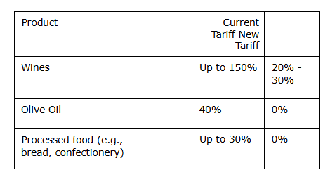 Οι δασμοί που επιβάλλει η Ινδία στον οίνο που παράγεται στην ΕΕ ανέρχονται στο 150%, ενώ βάσει της συμφωνίας θα μειωθούν σταδιακά στο 20% – 30%. Στην μπύρα οι δασμοί θα μειωθούν από το 150% στο 50%, στο ελαιόλαδο, τη μαργαρίνη και άλλα φυτικά έλαια οι δασμοί, που σήμερα ανέρχονται στο 45%, θα μηδενιστούν, ενώ στα ακτινίδια και τα αχλάδια οι δασμοί θα μειωθούν από το 33% στο 10%. Μηδενισμός των δασμών προβλέπεται και για τους χυμούς φρούτων και τις μη αλκοολούχες μπύρες, όπως επίσης και για τα επεξεργασμένα τρόφιμα (ψωμιά, αρτοσκευάσματα, μπισκότα, ζυμαρικά, σοκολάτα, τροφές για κατοικίδια).