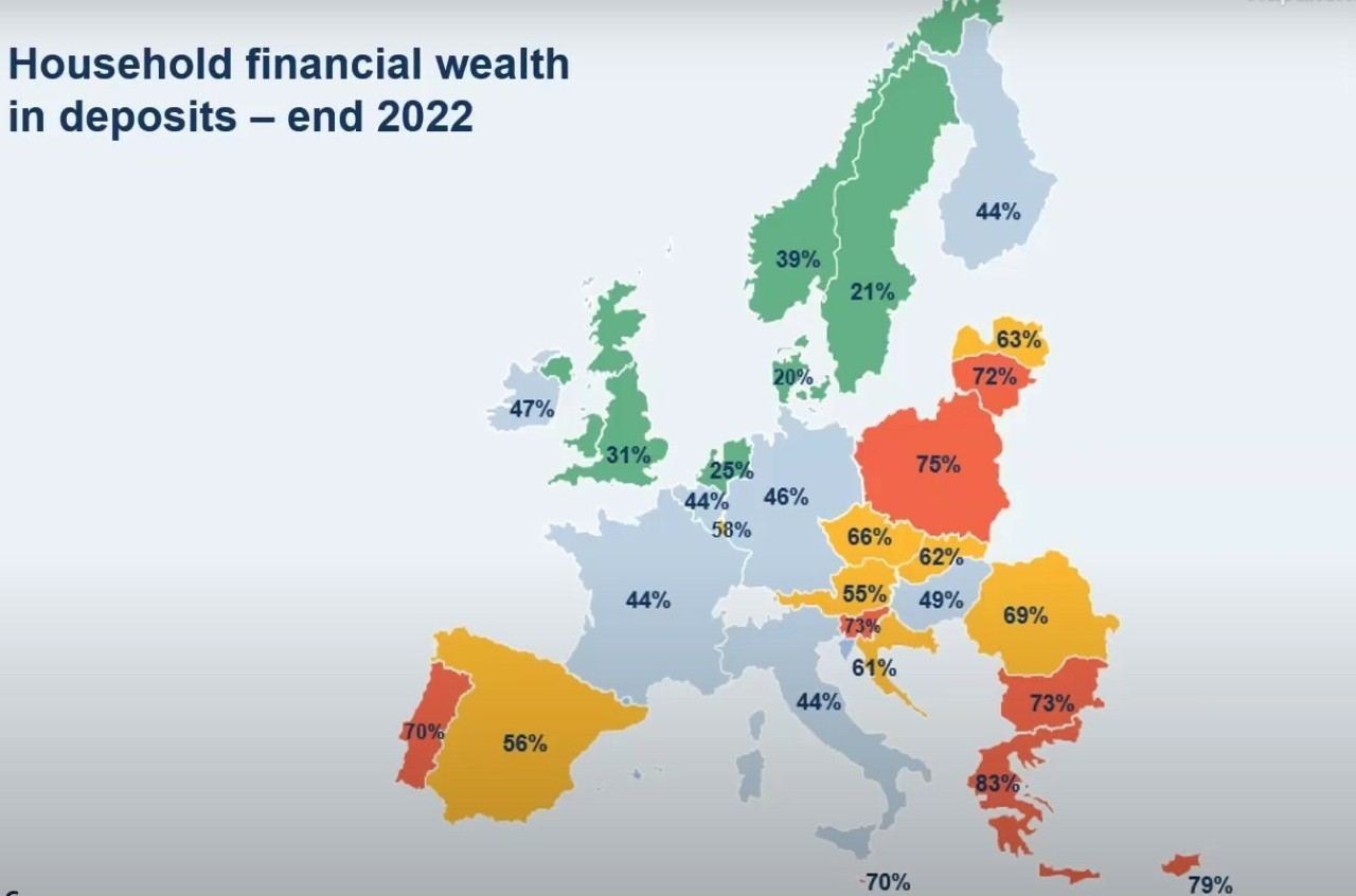 – παραμένουν σημαντικές διαφορές μεταξύ των ευρωπαϊκών κρατών στον τρόπο με τον οποίο τα νοικοκυριά κατανέμουν τις αποταμιεύσεις τους. Στη Δανία, τη Σουηδία και την Ολλανδία, τα νοικοκυριά κατέχουν λιγότερο από το 30% του χρηματοοικονομικού τους πλούτου σε καταθέσεις. Ωστόσο, το 2022 το μερίδιο των καταθέσεων ξεπέρασε το 70% σε Μάλτα, Πορτογαλία, Λιθουανία, Βουλγαρία, Σλοβενία, Πολωνία, Κύπρο και Ελλάδα.