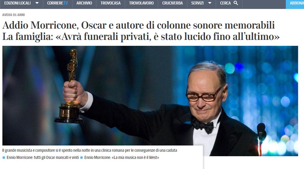 Έφυγε από τη ζωή ο σπουδαίος Ιταλός συνθέτης Ένιο Μορικόνε, σε ηλικία 92 ετών.