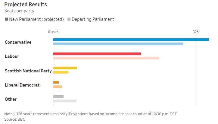 Με βάση το επίσημο έξιτ πολ, οι Τόρις προβλεπόταν να εξασφαλίσουν 368 έδρες. Με 595 από τις συνολικά 650 έδρες του κοινοβουλίου να έχουν κριθεί, οι Συντηρητικοί εξασφαλίζουν τις 326 μέχρι στιγμής, σύμφωνα με την καταμέτρηση του ITV και του Sky News. Την ίδια πρόβλεψη, ότι δηλαδή οι Συντηρητικοί θα έχουν την πλειοψηφία των εδρών στην επόμενη Βουλή των Κοινοτήτων, μετέδωσε επίσης η βρετανική δημόσια τηλεόραση, το δίκτυο BBC.