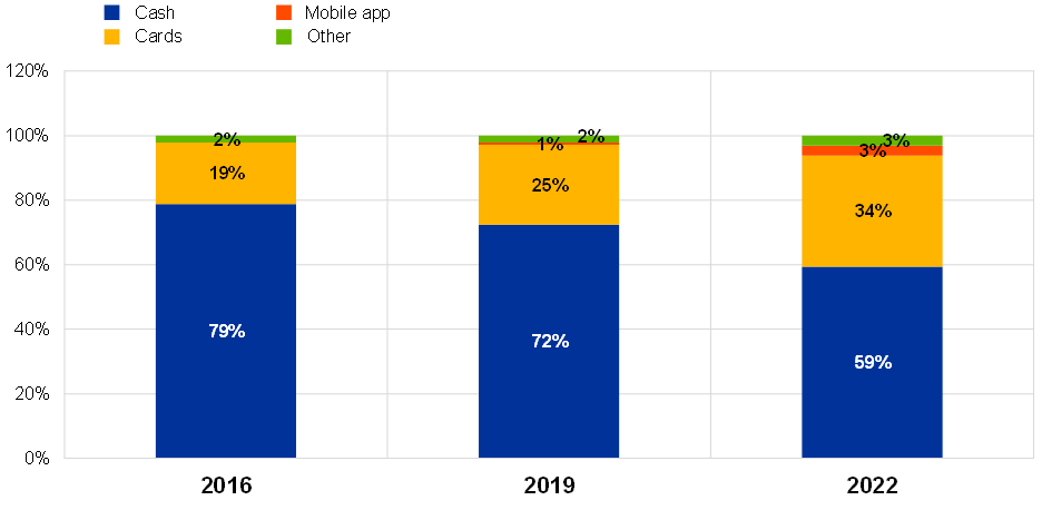 Αν και οι περισσότερες πληρωμές εξακολουθούσαν να γίνονται σε μετρητά, το 55% των καταναλωτών της ζώνης του ευρώ προτιμούν να πληρώνουν με κάρτα ή άλλα μέσα πληρωμής χωρίς μετρητά. Αυτό οφείλεται κυρίως στην ευκολία των πληρωμών χωρίς μετρητά.