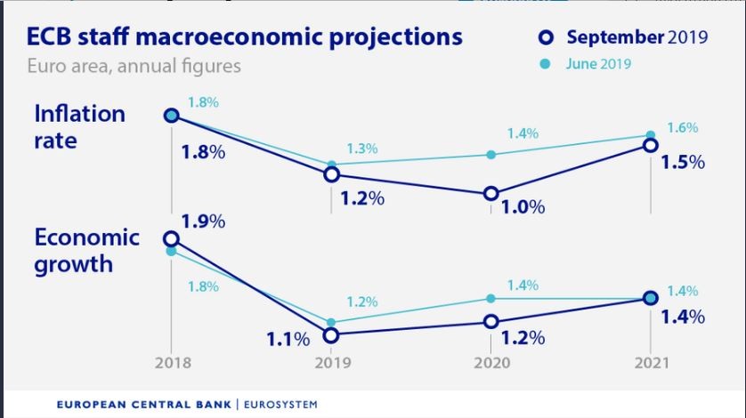Επιπλέον, ο πρόεδρος της ΕΚΤ δήλωσε ότι η ΕΚΤ μειώνει τις εκτιμήσεις της για τον πληθωρισμό της Ευρωζώνης, ο οποίος τώρα εκτιμά ότι διαμορφωθεί στο 1,2% το 2019, στο 1% το 2020 και στο 1,5% το 2021.