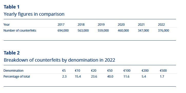 Παρά το εξαιρετικά μικρό ποσοστό, ο αριθμός των πλαστών τραπεζογραμματίων ευρώ αυξήθηκε κατά 8,4% συγκριτικά με το 2021 (βλ. Πίνακα 1), όταν το ποσοστό των πλαστών τραπεζογραμματίων ήταν στο χαμηλότερο επίπεδο από την εισαγωγή του ευρώ. Αυτή η αύξηση αντανακλά επίσης την ανάκαμψη της οικονομικής δραστηριότητας το 2022 μετά την άρση των περισσότερων περιοριστικών μέτρων που επιβλήθηκαν λόγω του κορωνοϊού (COVID-19). Τα τραπεζογραμμάτια των 20 και των 50 ευρώ εξακολούθησαν να καταγράφουν τα υψηλότερα ποσοστά παραχάραξης. Οι δύο αυτές ονομαστικές αξίες αντιστοιχούσαν μαζί σε ελαφρώς λιγότερο από τα δύο τρίτα του συνόλου των πλαστών τραπεζογραμματίων (βλ. Πίνακα 2).