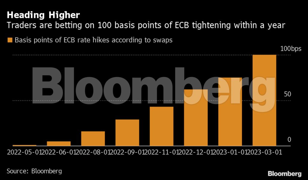 Όπως αναφέρει το πρακτορείο Bloomberg, οι χρηματαγορές ποντάρουν τώρα σε τέσσερις αυξήσεις των επιτοκίων έως τον Μάρτιο του 2023, οι οποίες θα μπορούσαν να ανεβάσουν το επιτόκιο καταθέσεων της ΕΚΤ στο 0,50%. Η τελευταία φορά που τα επιτόκια αυξήθηκαν τόσο γρήγορα ήταν πριν από 15 χρόνια, πριν από την έναρξη της παγκόσμιας χρηματοπιστωτικής κρίσης.