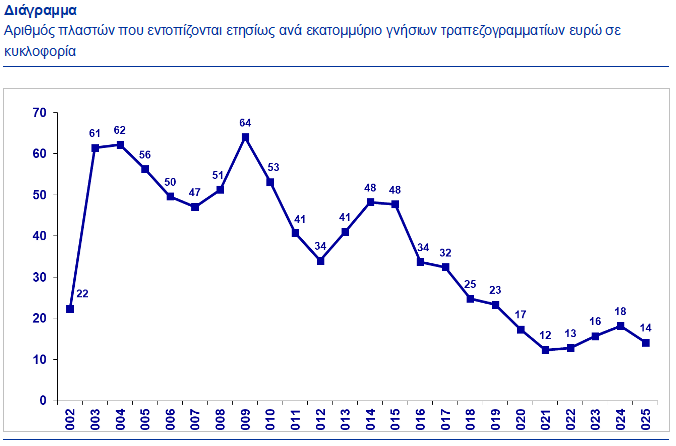 Σύμφωνα με έρευνα της ΕΚΤ, το 2025 εντοπίστηκαν 14 πλαστά ανά εκατομμύριο γνήσιων τραπεζογραμματίων σε κυκλοφορία. Πρόκειται για ένα από τα χαμηλότερα επίπεδα από την εισαγωγή του ευρώ και μετά.