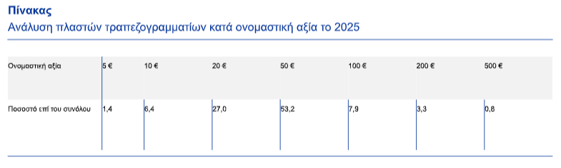 Περίπου 444.000 πλαστά τραπεζογραμμάτια ευρώ αποσύρθηκαν από την κυκλοφορία το 2025, δηλ. υπήρξε μείωση κατά 20% σε σύγκριση με το προηγούμενο έτος. Η πιθανότητα να λάβετε πλαστό τραπεζογραμμάτιο είναι μικρή, καθώς ο αριθμός των πλαστών τραπεζογραμματίων είναι πολύ χαμηλός σε σχέση με τα γνήσια τραπεζογραμμάτια ευρώ σε κυκλοφορία.