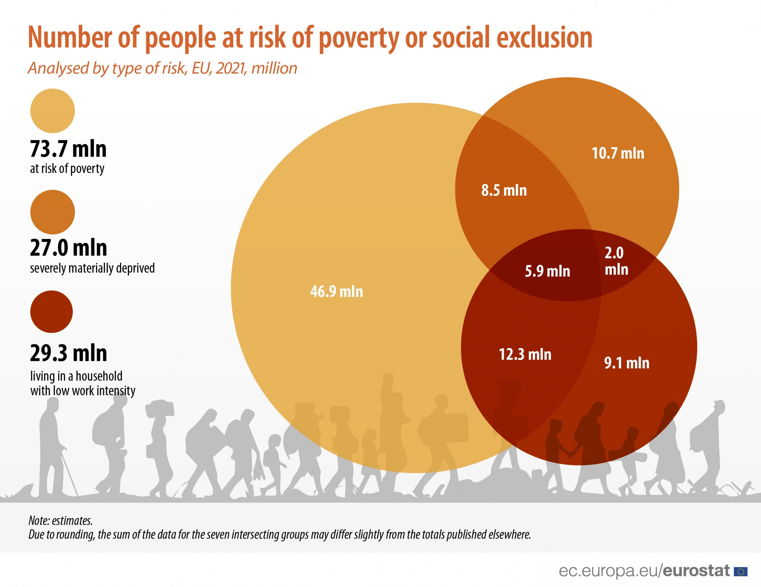 Ειδικότερα, το 2021, 95,4 εκατομμύρια άνθρωποι στην ΕΕ, που αντιπροσωπεύουν το 21,7% του πληθυσμού, διέτρεχαν κίνδυνο φτώχειας ή κοινωνικού αποκλεισμού, δηλαδή ζούσαν σε νοικοκυριά που αντιμετώπιζαν τουλάχιστον έναν από τους τρεις κινδύνους φτώχειας και κοινωνικού αποκλεισμού (κίνδυνο φτώχειας, σοβαρή υλική και κοινωνική στέρηση ή/και διαβίωση σε νοικοκυριό με πολύ χαμηλή ένταση εργασίας).