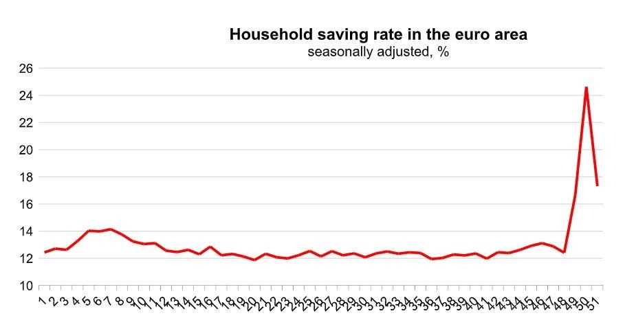 Μειωμένο κατά 17,3% το τρίτο τρίμηνο του 2020 είναι το ποσοστό αποταμίευσης των νοικοκυριών στη ζώνη του ευρώ, σε σύγκριση με το 24,6% το δεύτερο τρίμηνο του 2020. Παρά τη σημαντική αυτή μείωση, είναι το δεύτερο υψηλότερο ποσοστό από το 1999 και 4,4 ποσοστιαίες μονάδες υψηλότερα από ό, τι το ίδιο τρίμηνο του προηγούμενου έτους.