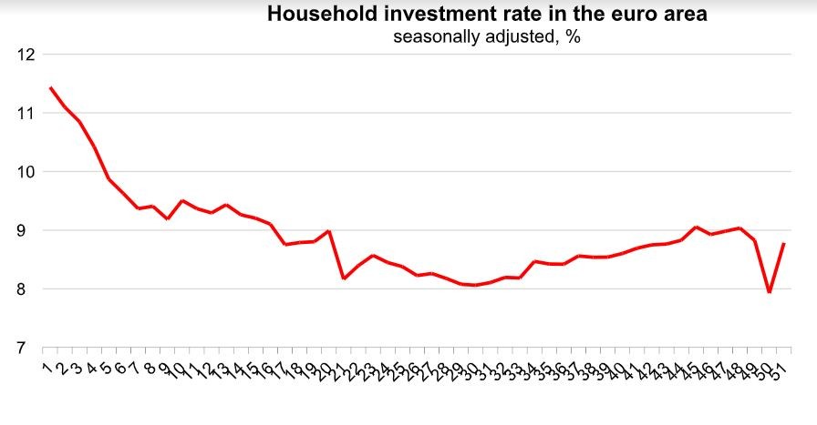 Ταυτόχρονα, το ποσοστό επένδυσης των νοικοκυριών στη ζώνη του ευρώ ήταν 8,8% το τρίτο τρίμηνο του 2020, ανακάμπτοντας από 7,9% το προηγούμενο τρίμηνο.