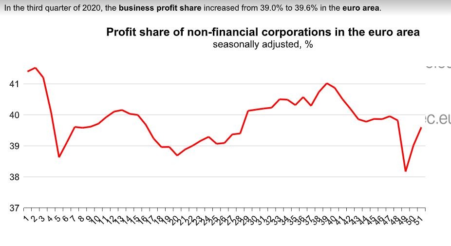 Το τρίτο τρίμηνο του 2020, το μερίδιο των επιχειρηματικών κερδών αυξήθηκε από 39,0% σε 39,6% στη ζώνη του ευρώ.
