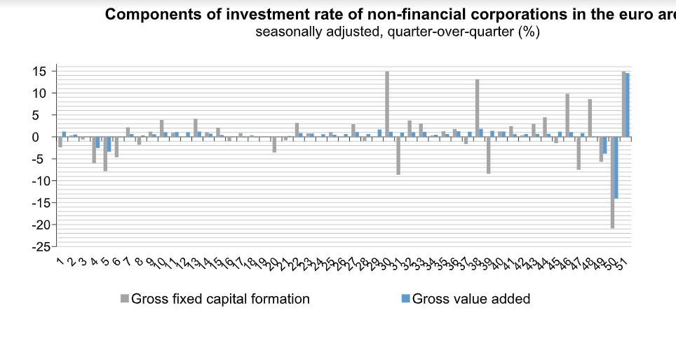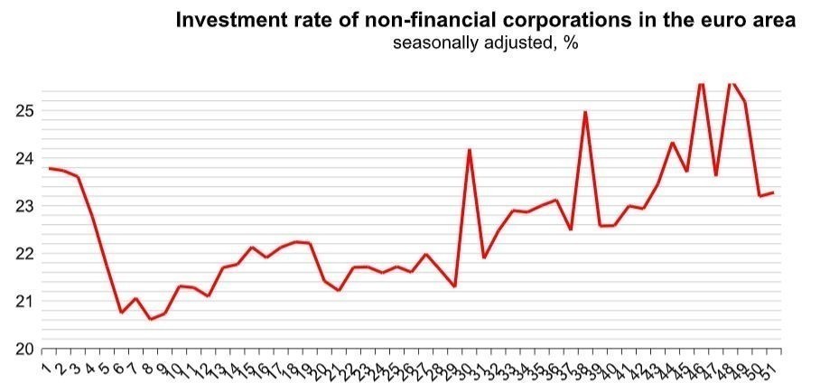 Το επιτόκιο των επιχειρηματικών επενδύσεων στη ζώνη του ευρώ παρέμεινε σχεδόν σταθερό στο 23,3%, σε σύγκριση με το 23,2% το δεύτερο τρίμηνο του 2020. Τα υψηλά ποσσοτά επενδύσεων των μη χρηματοπιστωτικών εταιρειών που παρατηρήθηκαν το 2015Q2, 2017Q2, 2019Q2, 2019Q4 και 2020Q1 σχετίζονται σε μεγάλες εισαγωγές προϊόντων πνευματικής ιδιοκτησίας.
