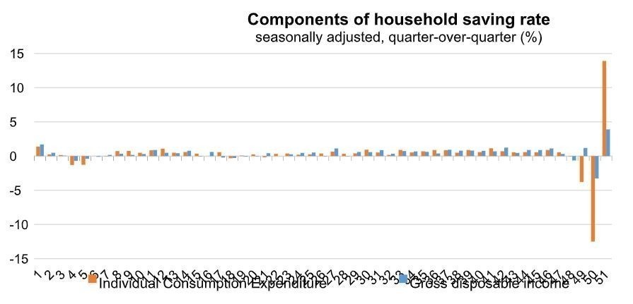 Η μείωση του ποσοστού αποταμίευσης των νοικοκυριών εξηγείται από την απότομη ανάκαμψη της κατανάλωσής τους (+ 13,9%), με πολύ υψηλότερο ρυθμό από την ανάκτηση του ακαθάριστου διαθέσιμου εισοδήματος των νοικοκυριών (+ 3,9%).