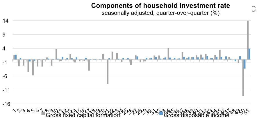 Η τριμηνιαία αύξηση 0,9 εκατοστιαίων μονάδων στο επενδυτικό ποσοστό των νοικοκυριών εξηγείται από την αύξηση κατά 15,1% στον ακαθάριστο σχηματισμό παγίου κεφαλαίου, ενώ η αύξηση του ακαθάριστου διαθέσιμου εισοδήματος ήταν πολύ πιο μέτριο.