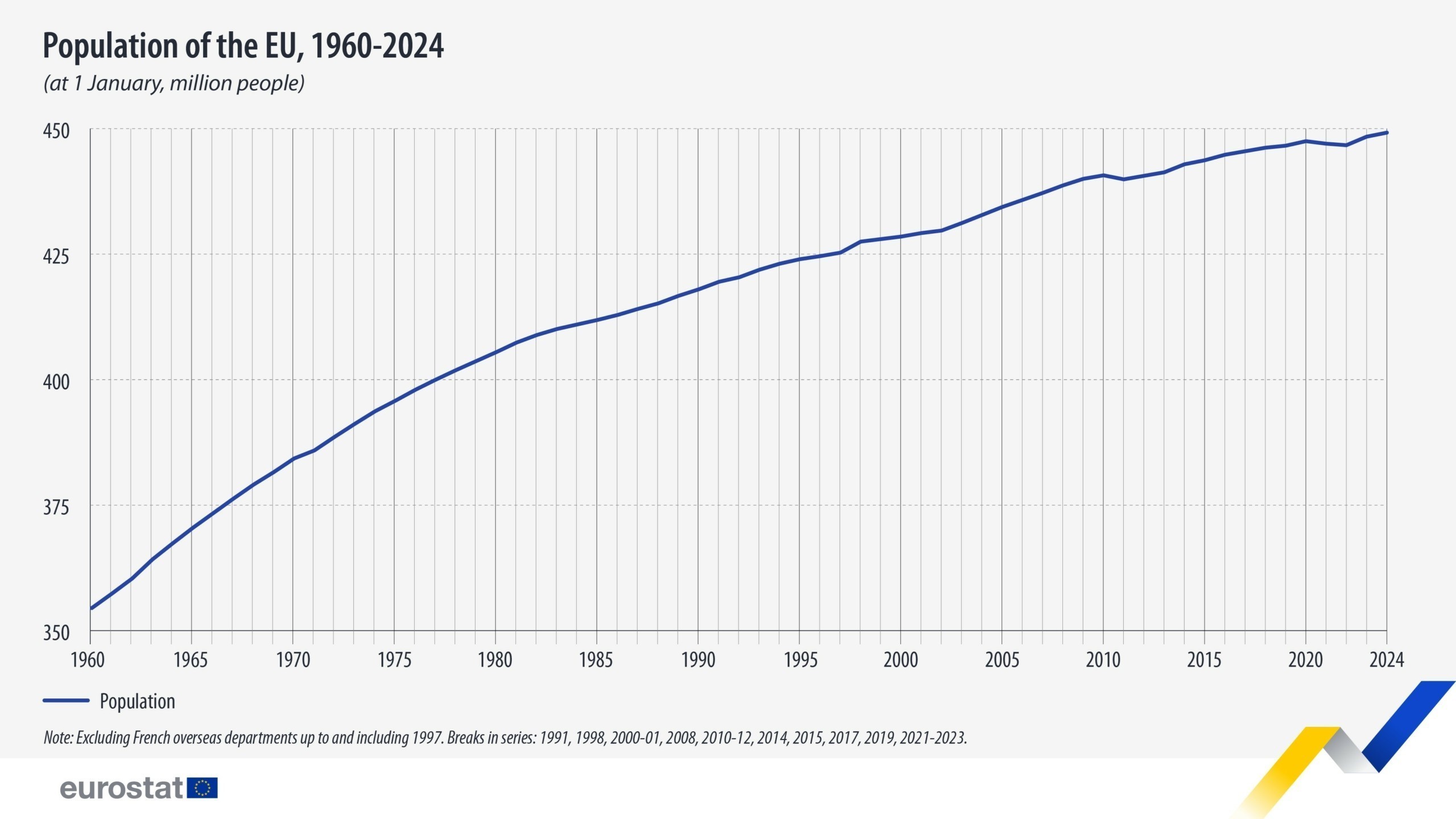 Εξετάζοντας ένα μεγαλύτερο χρονικό διάστημα, ο πληθυσμός της ΕΕ αυξήθηκε από 354,5 εκατομμύρια το 1960 σε 449,2 εκατομμύρια την 1η Ιανουαρίου 2024, δηλαδή κατά 94,7 εκατομμύρια άτομα. Ο ρυθμός αύξησης του πληθυσμού έχει σταδιακά επιβραδυνθεί τις τελευταίες δεκαετίες: ο πληθυσμός της ΕΕ αυξήθηκε κατά μέσο όρο κατά περίπου 0,6 εκατομμύρια άτομα ετησίως κατά την περίοδο 2015-2024, ενώ η μέση αύξηση τη δεκαετία του 1960 ήταν 2,9 εκατομμύρια άτομα ετησίως.