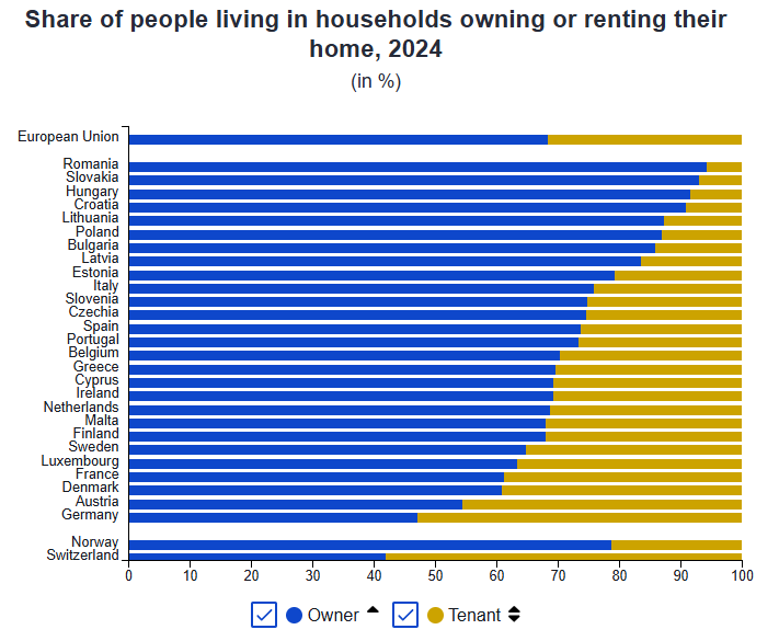Η ιδιοκατοίκηση ήταν πιο διαδεδομένη σε όλες τις χώρες της ΕΕ, με εξαίρεση τη Γερμανία, όπου κυριάρχησε η ενοικίαση, καθώς το 53% του πληθυσμού ήταν ενοικιαστές. Ακολούθησαν η Αυστρία (46%) και η Δανία (39%).