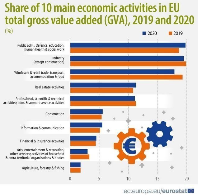 Πιο συγκεκριμένα, το 2020, οι δραστηριότητες «Δημόσιας Διοίκησης, Άμυνας, Εκπαίδευσης, Ανθρώπινης Υγείας και Κοινωνικές Υπηρεσίας» έγιναν οι πιο σημαντικές οικονομικές δραστηριότητες στην ΕΕ, σύμφωνα με τα στοιχεία που δημοσίευσε η Ευρωπαϊκή Στατιστική Αρχή (Eurostat).