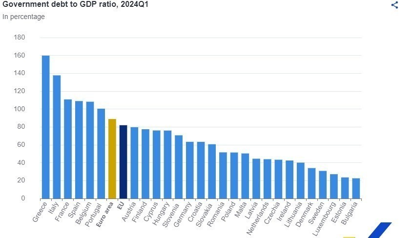 Οι υψηλότεροι δείκτες του δημόσιου χρέους προς το ΑΕΠ στο τέλος του πρώτου τριμήνου του 2024 καταγράφηκαν στην Ελλάδα (159,8%), στην Ιταλία (137,7%), στη Γαλλία (110,8%), στην Ισπανία (108,9%), στο Βέλγιο (108,2%) και στην Πορτογαλία (100,4%), και τα χαμηλότερα καταγράφηκαν στη Βουλγαρία (22,6%), στην Εσθονία (23,6%) και στο Λουξεμβούργο (27,2%).