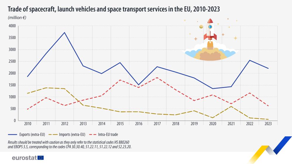 Το 2023, οι εξαγωγές της Ευρωπαϊκής Ένωσης σε διαστημόπλοια και υπηρεσίες διαστημικών μεταφορών ανήλθαν σε 2,205 δισ. ευρώ, ενώ οι αντίστοιχες εισαγωγές διαμορφώθηκαν στα 628 εκατ. ευρώ, σύμφωνα με τα στοιχεία της ενοποιημένης αποτύπωσης διεθνούς εμπορίου FIGARO που επεξεργάστηκε η Eurostat.