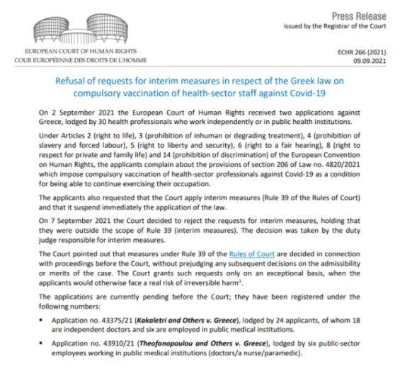 Το Ευρωπαϊκό Δικαστήριο Δικαιωμάτων του Ανθρώπου απέρριψε αιτήματα προσωρινής δικαστικής προστασίας που υπέβαλαν Ελληνες υγειονομικοί κατά του υποχρεωτικού εμβολιασμού.