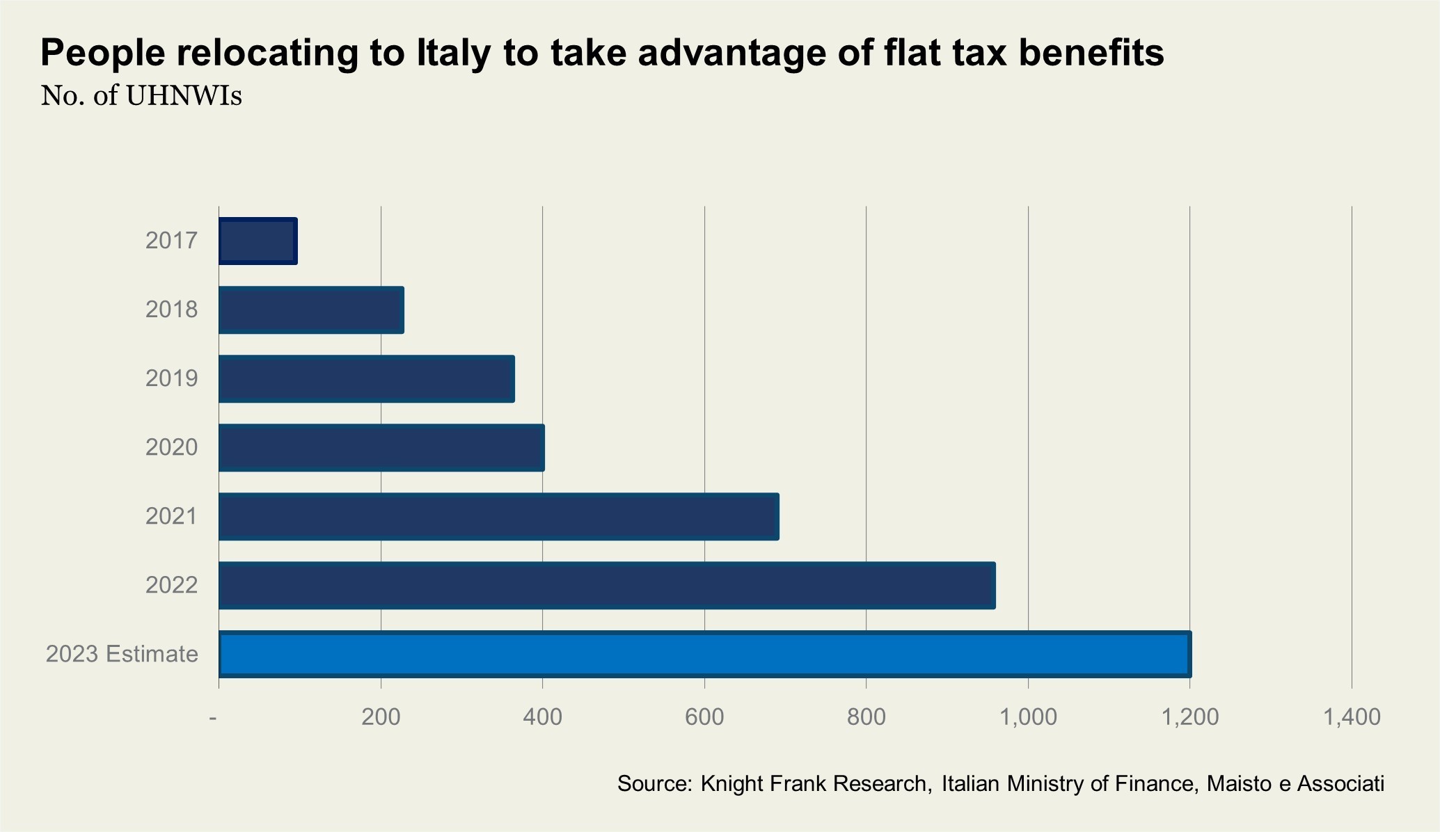 Όπως επισημαίνει η διεθνής συμβουλευτική εταιρεία Knight Frank, «υπάρχουν επιπλέον 90.000 άτομα, κυρίως Ιταλοί, που επωφελούνται από ένα πρόγραμμα αποδήμων που παρέχει μείωση από 50% έως 90% στο φορολογητέο ιταλικό εισόδημα για όσους επιστρέφουν στην Ιταλία, ανάλογα με την τοποθεσία στην οποία μετακομίζουν.»