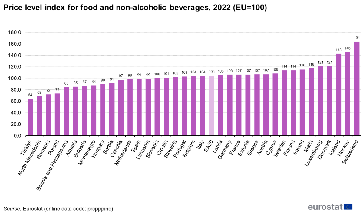 Το 2022, οι τιμές για τα τρόφιμα και τα μη αλκοολούχα ποτά στη Δανία και το Λουξεμβούργο ήταν 21 % πάνω από τον μέσο όρο της ΕΕ, ενώ στη Ρουμανία ήταν 28 % κάτω από τον μέσο όρο της ΕΕ.