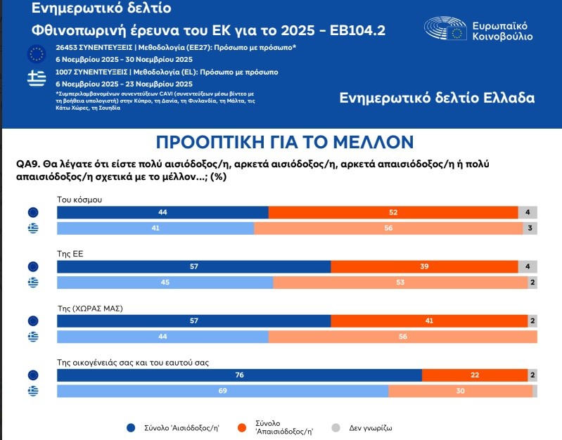 Παρότι οι περισσότεροι ερωτηθέντες αναμένουν ότι το βιοτικό τους επίπεδο θα παραμείνει σταθερό τα επόμενα πέντε χρόνια, ένα σημαντικό ποσοστό προβλέπει επιδείνωση (28% σε επίπεδο ΕΕ, 39% στην Ελλάδα και 33% στην Κύπρο), ιδίως σε χώρες όπου επικρατεί αίσθημα οικονομικής αβεβαιότητας. Ο φόβος για μείωση του βιοτικού επιπέδου είναι μεγαλύτερος στη Γαλλία (45%), στο Βέλγιο και στη Σλοβακία (από 40%).