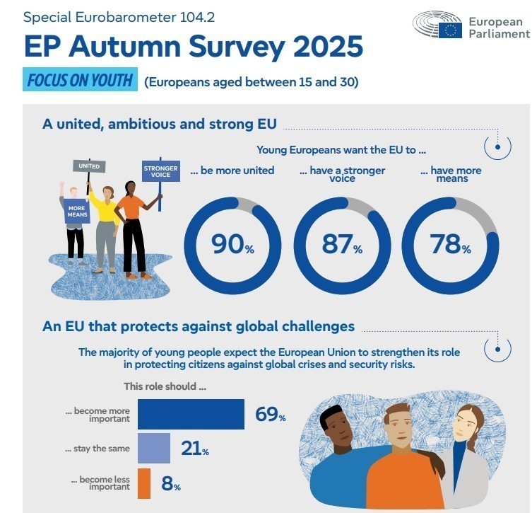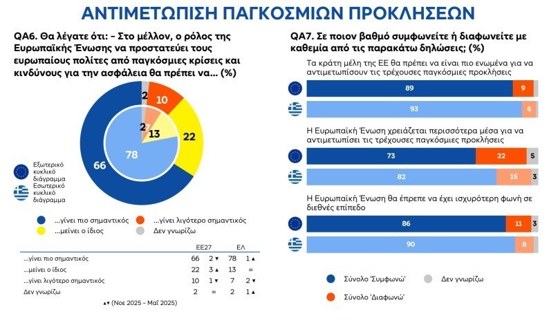 Εντεινόμενη προτεραιότητα αποτελεί επίσης για τους πολίτες η ενίσχυση του διεθνούς ρόλου της ΕΕ, ιδίως μέσω της άμυνας και της ασφάλειας, καθώς τα ποσοστά που αναφέρθηκαν παραπάνω σημειώνουν αύξηση τριών ποσοστιαίων μονάδων σε ευρωπαϊκό επίπεδο, τεσσάρων μονάδων στην Κύπρο, ενώ ίδιο παραμένει το ποσοστό στην Ελλάδα σε σύγκριση με την προηγούμενη έρευνα.