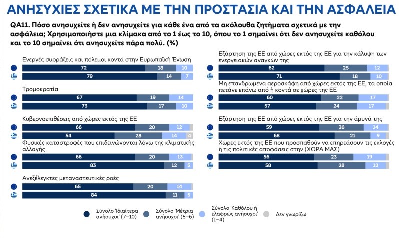 Στην Ελλάδα και την Κύπρο αναφέρονται επίσης το δημογραφικό, η μετανάστευση και η γήρανση του πληθυσμού (30% και 28% αντίστοιχα), καθώς και η εκπαίδευση (31% και 37%).