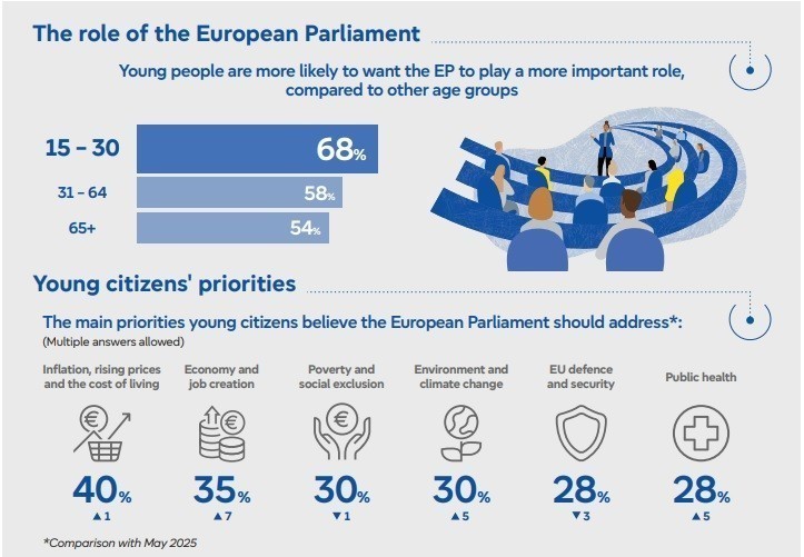 Παράλληλα, οι πολίτες επιβεβαιώνουν τη σημασία θεμελιωδών αξιών. Η ειρήνη αναδεικνύεται ως η αξία που οι πολίτες επιθυμούν περισσότερο να υπερασπιστεί το Ευρωπαϊκό Κοινοβούλιο (52% σε επίπεδο ΕΕ, 60% στην Ελλάδα και 48% στην Κύπρο), γεγονός που αντανακλά το τρέχον γεωπολιτικό κλίμα. Ακολουθούν η δημοκρατία (35% στην ΕΕ, 37% στην Ελλάδα και 40% στην Κύπρο), η ελευθερία του λόγου (23% στην ΕΕ και την Ελλάδα, 20% στην Κύπρο), τα ανθρώπινα δικαιώματα (22%, 25% και 29% αντίστοιχα) και το κράτος δικαίου (21% στην ΕΕ, 38% στην Ελλάδα και 35% στην Κύπρο), που παραμένουν επίσης σημαντικές προσδοκίες των Ευρωπαίων.