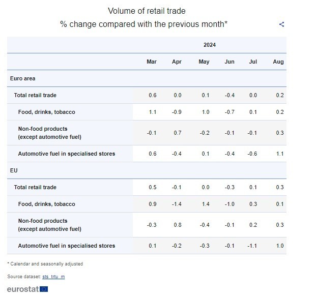 Στη ζώνη του ευρώ τον Αύγουστο του 2024, σε σύγκριση με τον Ιούλιο του 2024, ο όγκος του λιανικού εμπορίου