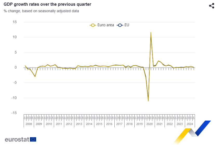 Σύμφωνα με την ευρωπαϊκή στατιστική αρχή, κατά το δ’ τρίμηνο του 2024, το εποχικά διορθωμένο ΑΕΠ παρέμεινε σταθερό στην ευρωζώνη και αυξήθηκε κατά 0,1% στην ΕΕ, σε σύγκριση με το προηγούμενο τρίμηνο. Το γ’ τρίμηνο του 2024, το ΑΕΠ είχε αυξηθεί κατά 0,4% και στις δύο περιοχές.