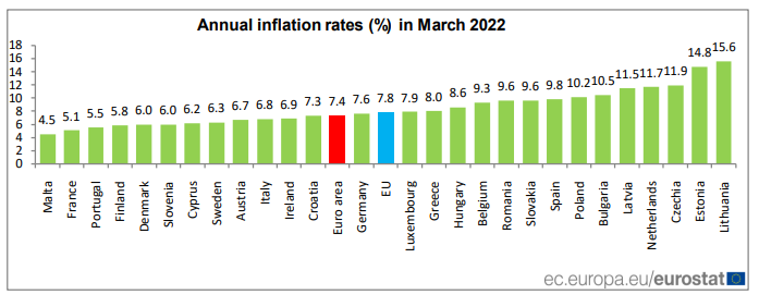 Ελαφρώς χαμηλότερος ήταν τον Μάρτιο -από ό,τι είχε αρχικά εκτιμηθεί- ο πληθωρισμός στην ευρωζώνη, όπως δείχνουν τα τελικά στοιχεία που δημοσίευσε η Eurostat την Πέμπτη, αλλά παραμένει σε επίπεδο πρωτοφανές στην ιστορία της ευρωζώνης λόγω της έκρηξης των τιμών της ενέργειας.