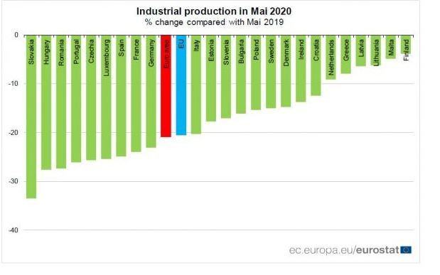 Στη Γαλλία και την Ισπανία η αύξηση ανήλθε στο 20% και 15,1%, αντίστοιχα. Η Γερμανία είδε την παραγωγή της να αυξάνεται κάτω από 10%, γεγονός που σημαίνει ότι σε όλες τις μεγάλες οικονομίες της ευρωζώνης τα επίπεδα παραγωγής υπολείπονται κατά περίπου 1/4 σε σχέση με πέρυσι. Αυτό σημαίνει ότι οι μικρότερες οικονομίες ξεπερνούν τις μεγαλύτερες σε ό,τι αφορά τη βιομηχανική παραγωγή. Η μείωση ήταν ηπιότερη και η αρχική ανάκαμψη ήταν επίσης μικρότερη, αλλά καθώς υπολείπεται ακόμα μεγάλο ποσοστό ανάκαμψης, φαίνεται ότι οι μεγαλύτερες βιομηχανικές οικονομίες βρίσκονται σε μειονεκτική θέση.
