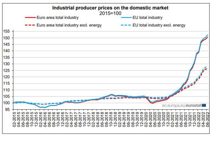 Ανά κλάδους της οικονομίας, οι μεγαλύτερες αυξήσεις στον δείκτη για την Ευρωζώνη σημειώθηκαν στην ενέργεια (στο +92,8% σε σχέση με τον Ιούνιο του 2021) και στα ενδιάμεσα αγαθά (στο 23,8%).