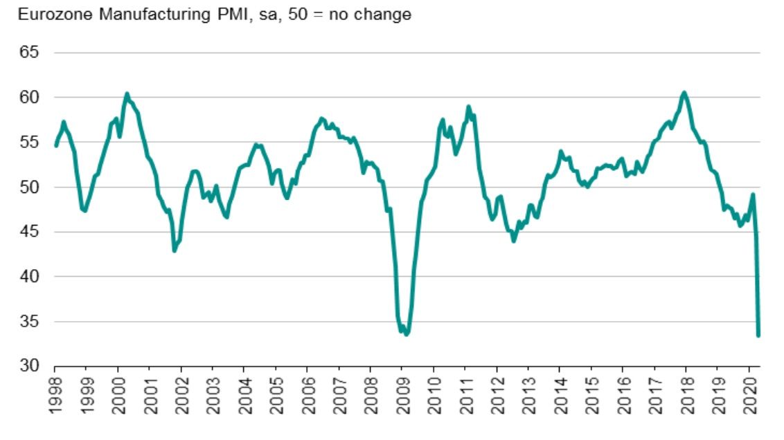 «Η βιομηχανική παραγωγή στην Ευρωζώνη, τον Απρίλιο έκανε βουτιά με ρυθμούς που δεν έχουμε ξαναδεί στην ιστορία των 23 ετών των μετρήσεων PMI, αντανακλώντας ένα συνδυασμό παραγόντων, όπως εκτεταμένο κλείσιμο των εργοστασίων, τη μείωση της ζήτησης και τις ελλείψεις στο κομμάτι της προσφοράς και όλα αυτά συνδέονται με το ξέσπασμα του Covid-19», αναφέρει ο Κρις Γουίλιαμσον, επικεφαλής οικονομολόγος της IHS Markit.