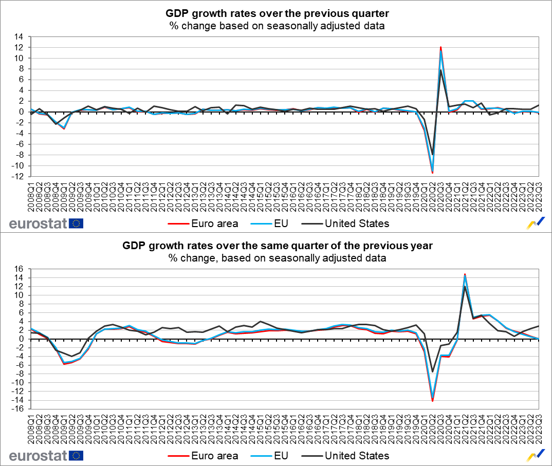 Πιο αναλυτικά, σε σύγκριση με το αντίστοιχο τρίμηνο του προηγούμενου έτους, το ΑΕΠ παρέμεινε σταθερό σε Ευρωζώνη και Ε.Ε. το γ’ τρίμηνο του 2023, μετά από αύξηση 0,6% στη ζώνη του ευρώ και 0,5% στην Ε.Ε. το προηγούμενο τρίμηνο.
