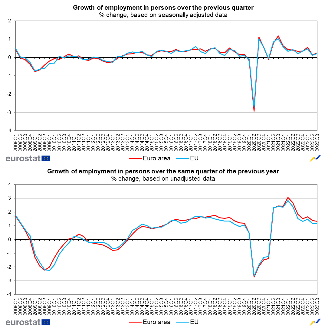 Σε σύγκριση με το ίδιο τρίμηνο του προηγούμενου έτους, η απασχόληση αυξήθηκε κατά 1,3% στη Ζώνη του Ευρώ και κατά 1,2% στην Ε.Ε. το γ’ τρίμηνο του 2023, μετά από +1,4% στη ζώνη του ευρώ και +1,2% στην Ε.Ε. το β’ τρίμηνο του 2023.