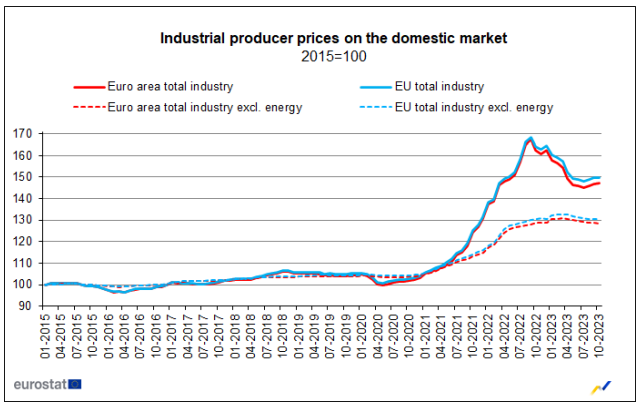 Τον Οκτώβριο του 2023, οι τιμές παραγωγού της βιομηχανίας αυξήθηκαν κατά 0,2% τόσο στη ζώνη του ευρώ όσο και στην ΕΕ, σε σύγκριση με Σεπτέμβριο του 2023, σύμφωνα με τις εκτιμήσεις της Eurostat. Τον Σεπτέμβριο του 2023, οι τιμές αυξήθηκαν κατά 0,5% τόσο στη ζώνη του ευρώ όσο και στην ΕΕ.